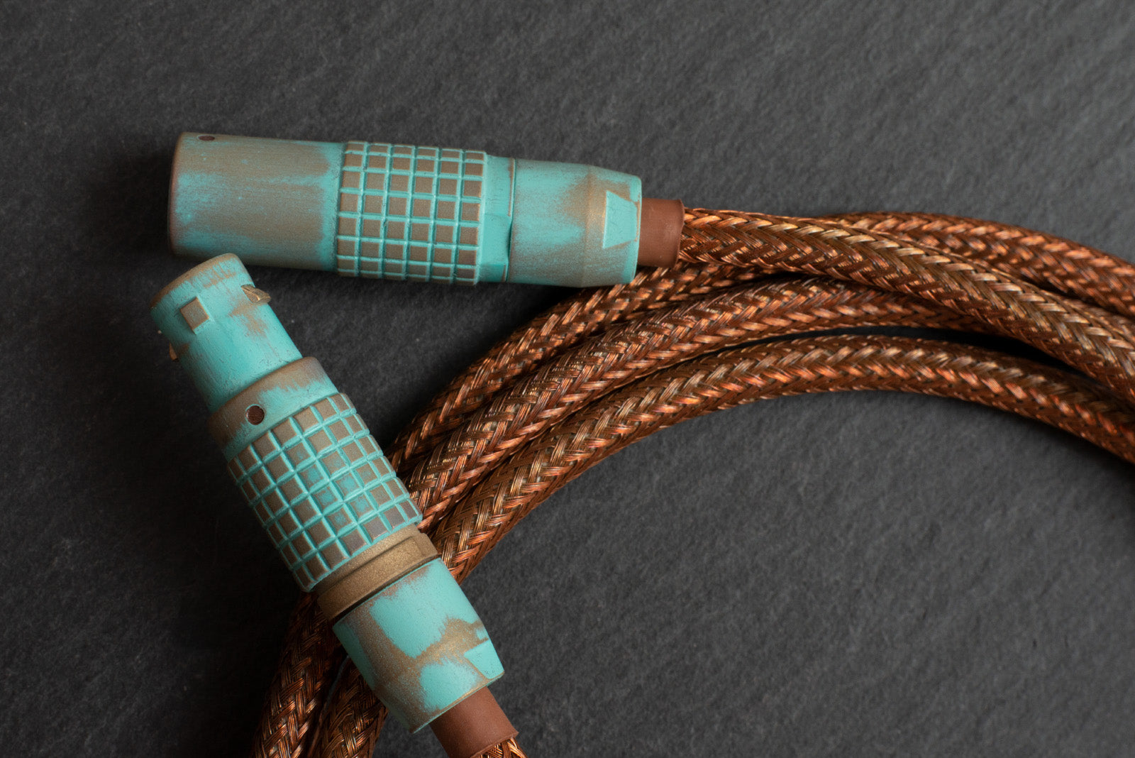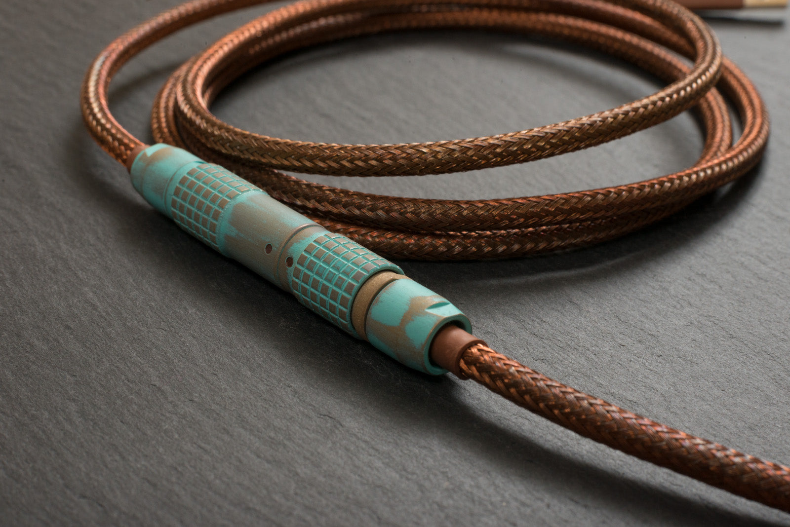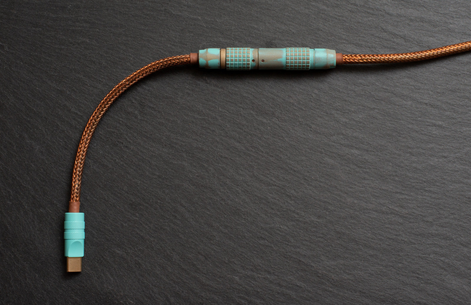 A stunning hand made cable designed to match GMK Copper, just like our "Copper" cable, but with a patina effect, and chemically aged raw copper sleeving. Our custom formulated Cerakote is a 1:1 colour match to GMK Copper accent keys, and the Techflex raw copper sleeving has a mellow, antique patterned patina.