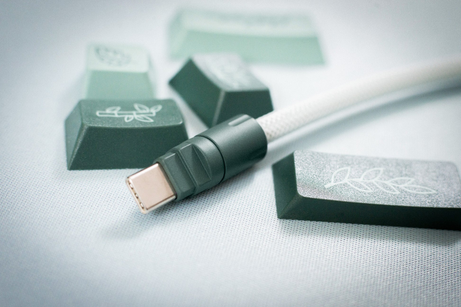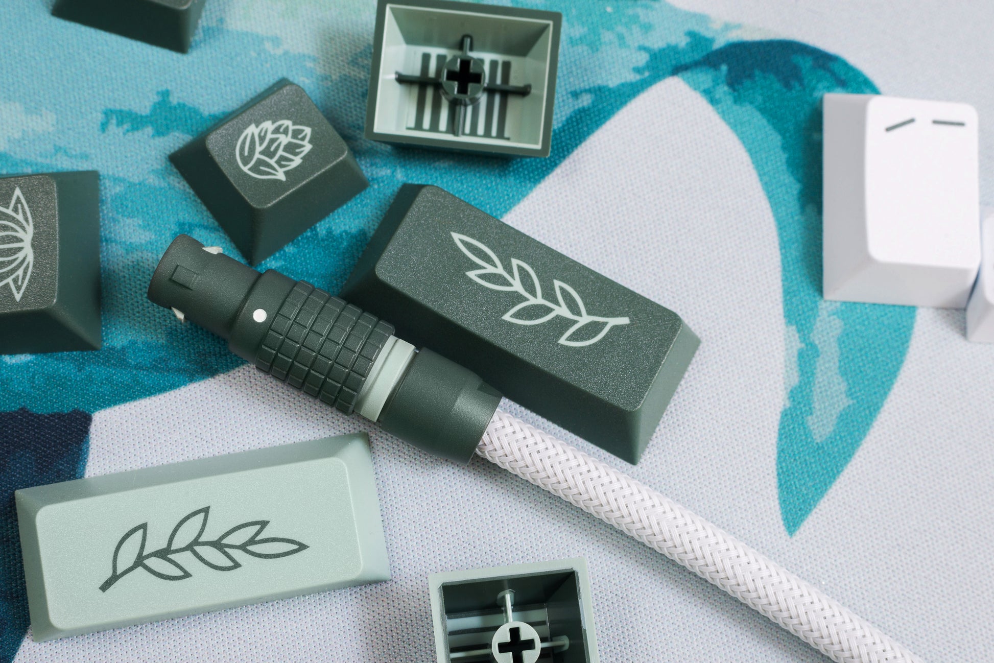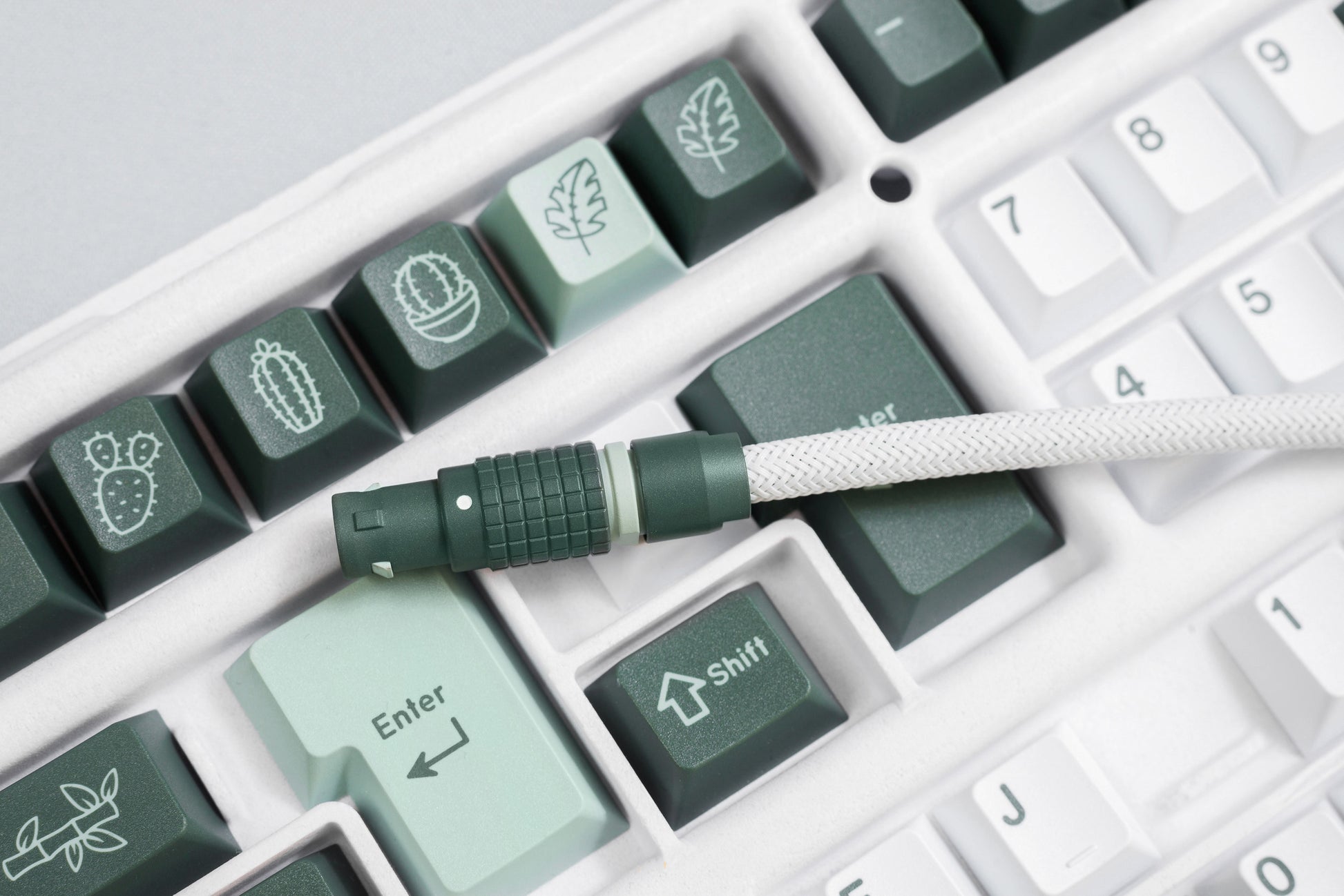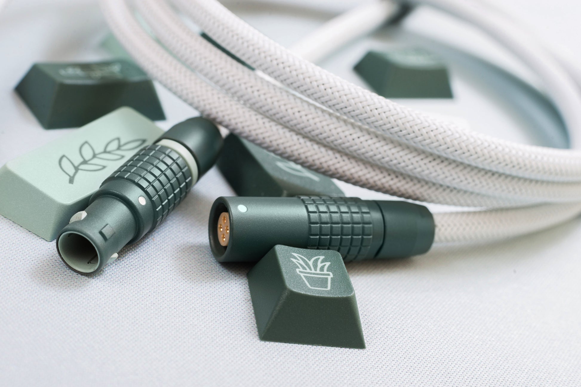 Quick Connect: 1B Lemo style finished in custom formulated Cerakote to match GMK Botanical keycaps. Main body matches the modifier keys, with the accent ring matching accent keys. All soldered connections are insulated with injected silicon.