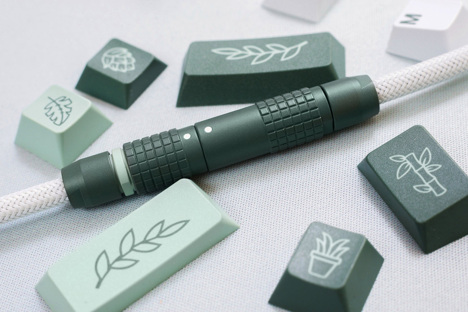 Sleeving: Custom dyed MDPC-X XTC giving a perfect match for GMK Botanical alpha keys. Double sleeved.