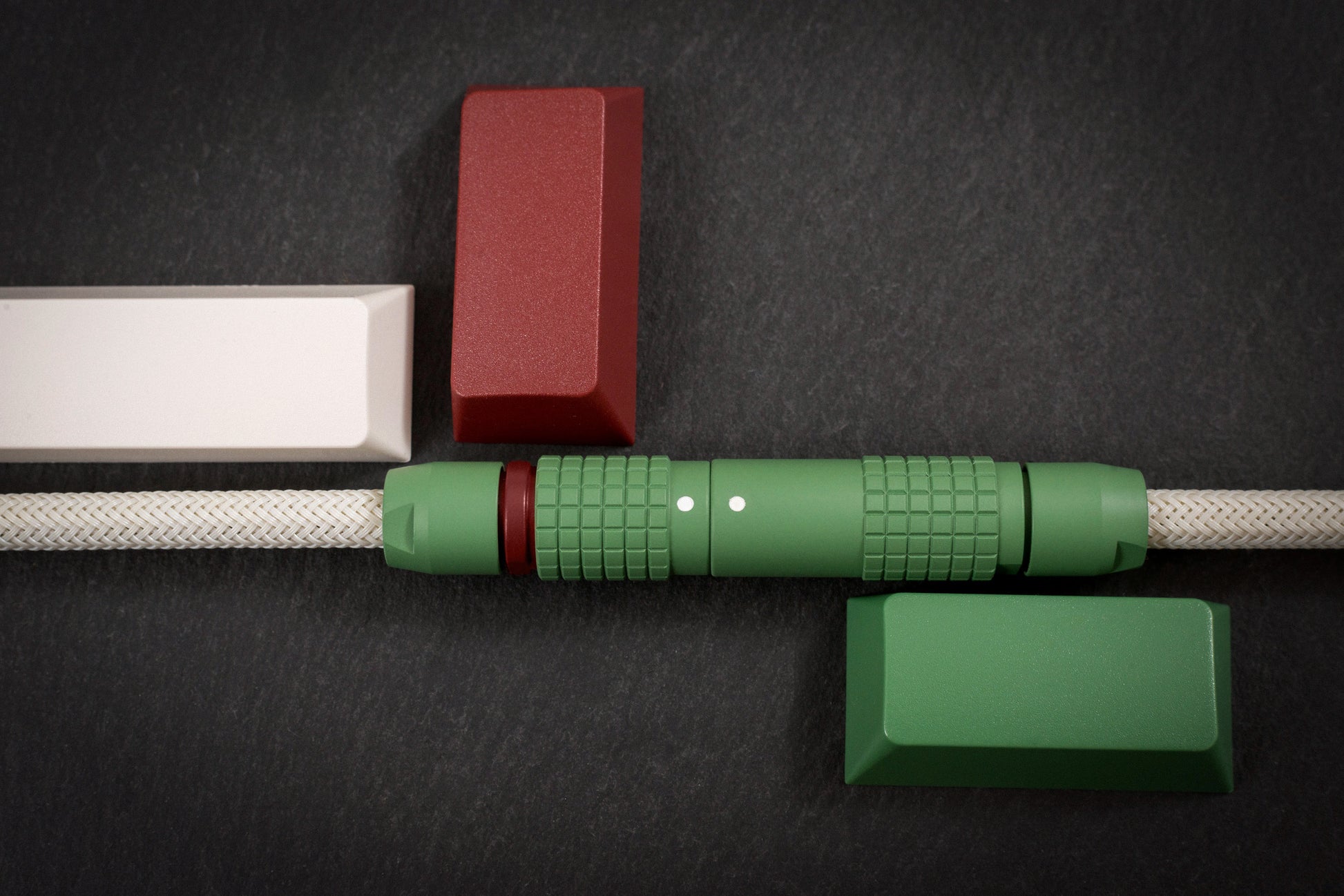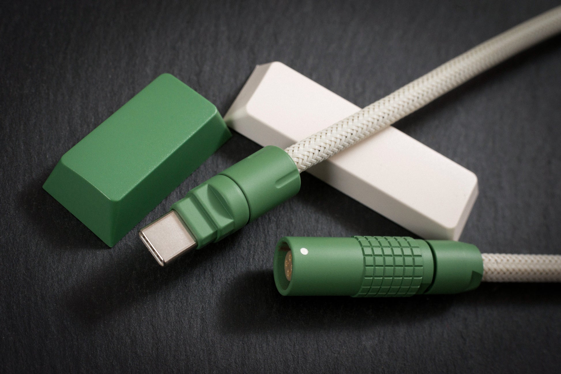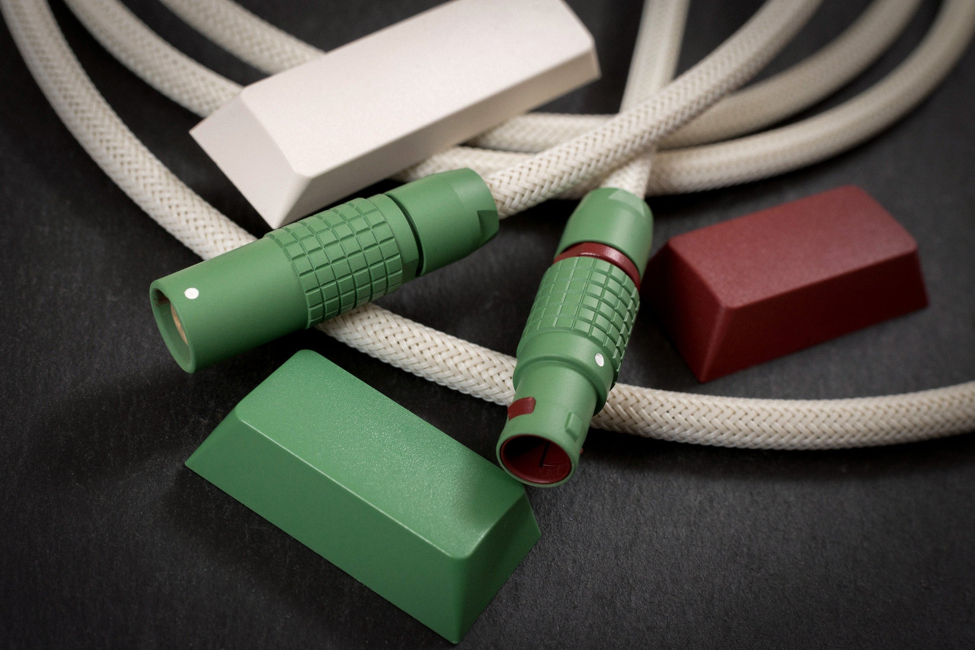 Quick Connect: 1B Lemo style finished in custom formulated Cerakote to match GMK Camping keycaps. Main body matches the modifier keys, with the accent ring matching accent keys keys. All soldered connections are insulated with injected silicon.