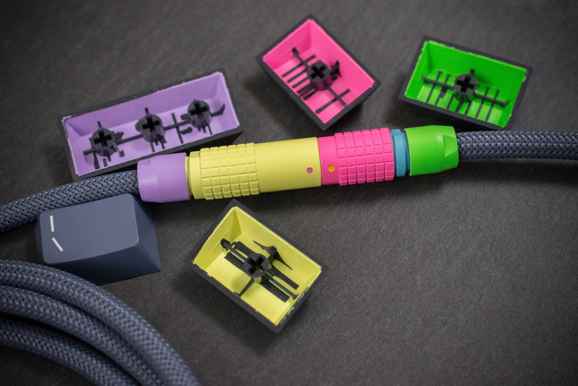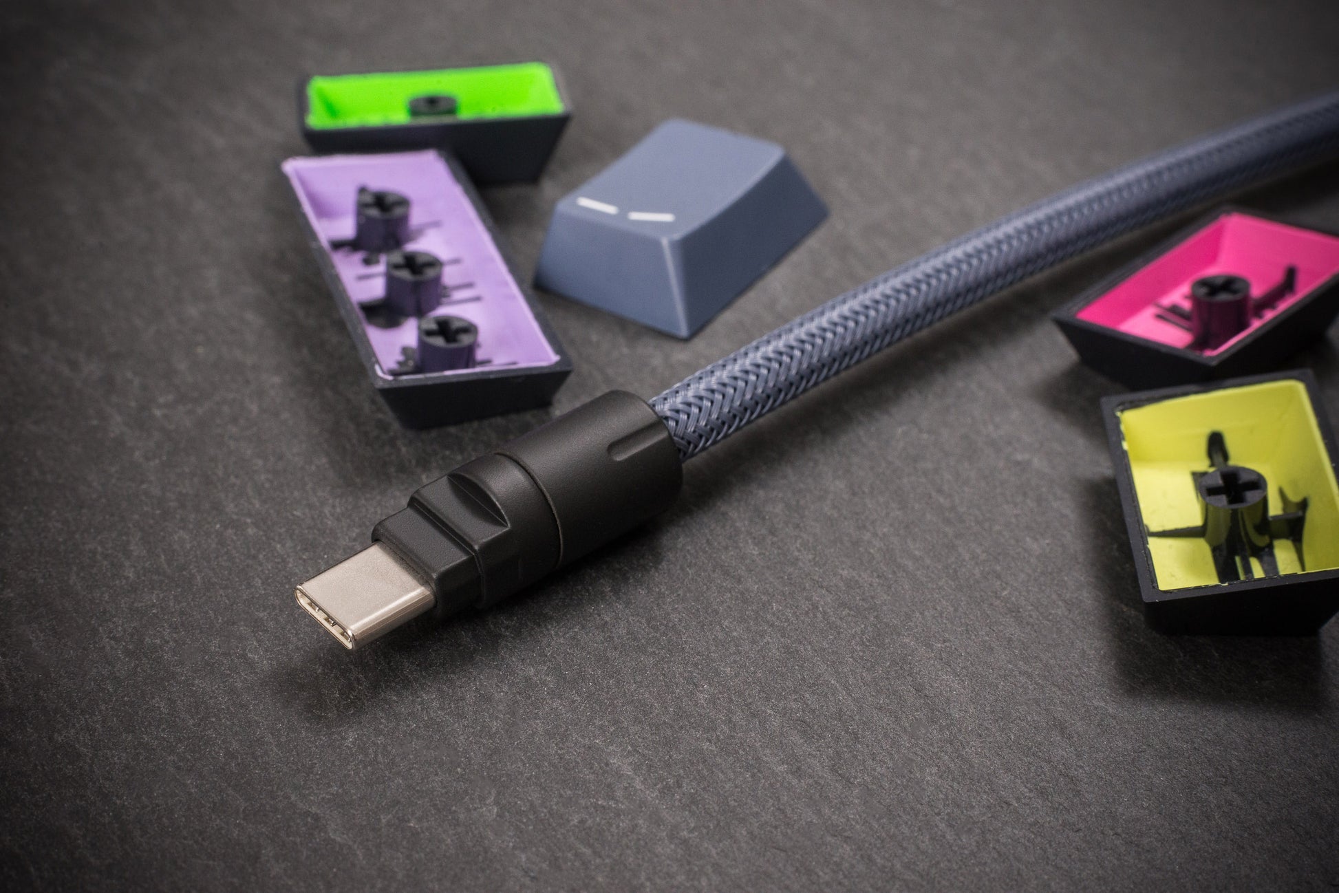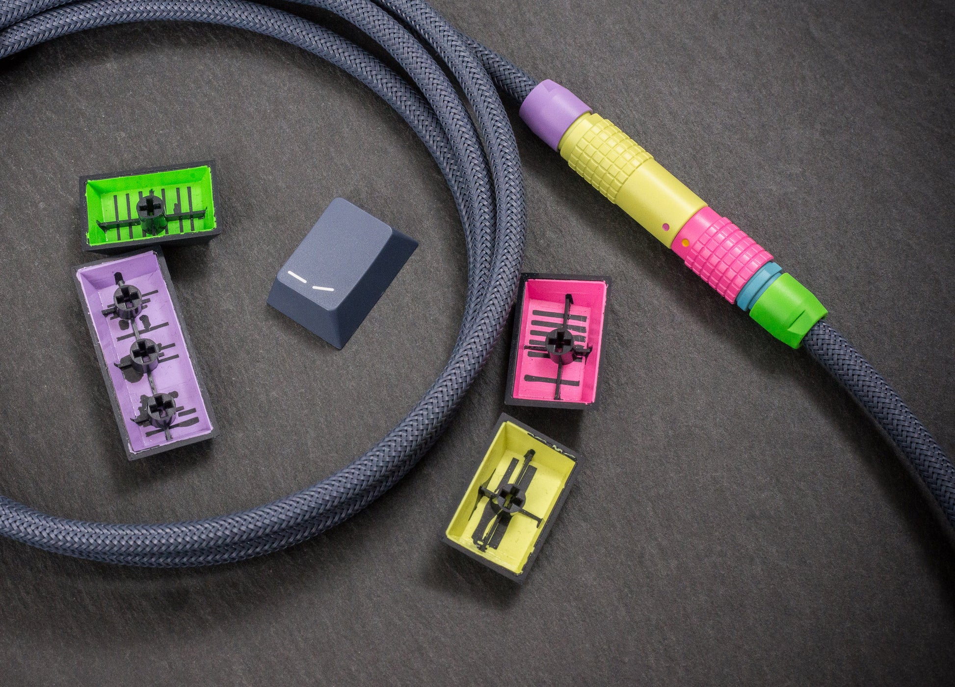 Certain ABS plastics are prone to fade or colour change with age and UV exposure, and also resin mixing tolerances are not perfect for any manufacturer from batch to batch, so one round of a keycap set may be slightly different from the next. Being different materials than the keycaps, Cerakote and sleeving may also appear different in certain lighting due to differences in surface texture. We have done all we can within the limits of practicality to ensure the best colour match, but minute differences may sometimes be beyond our control.