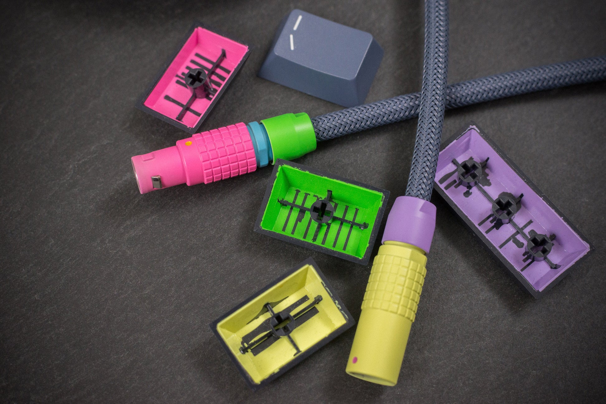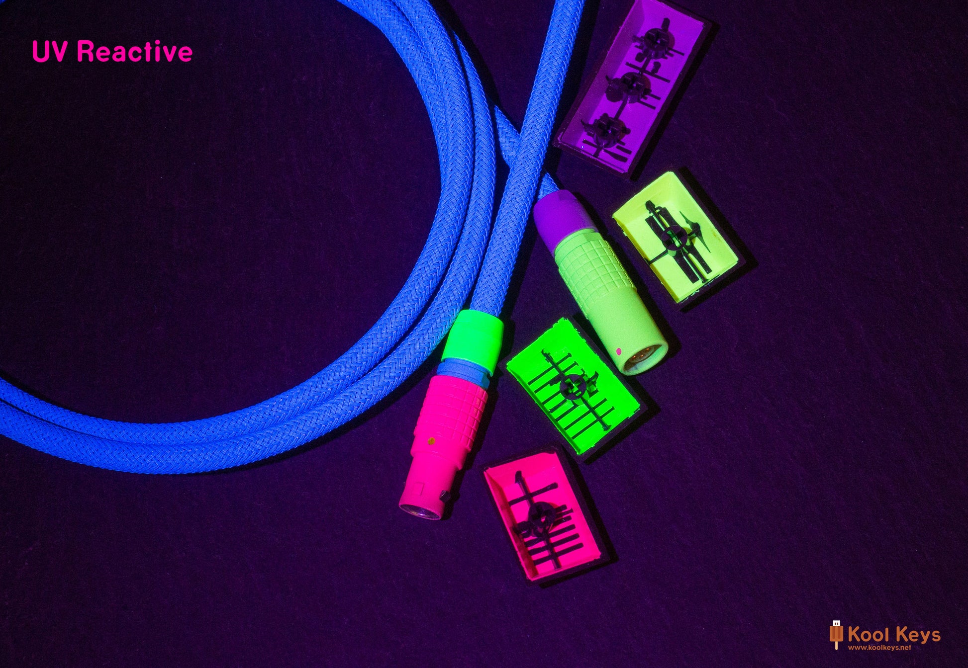 Quick Connect: 1B Lemo style finished in five custom formulated Cerakote colours to match GMK Dracula Highlight keycaps. All soldered connections are insulated with injected silicon. The custom Cerakote is UV reactive just like the keycaps.