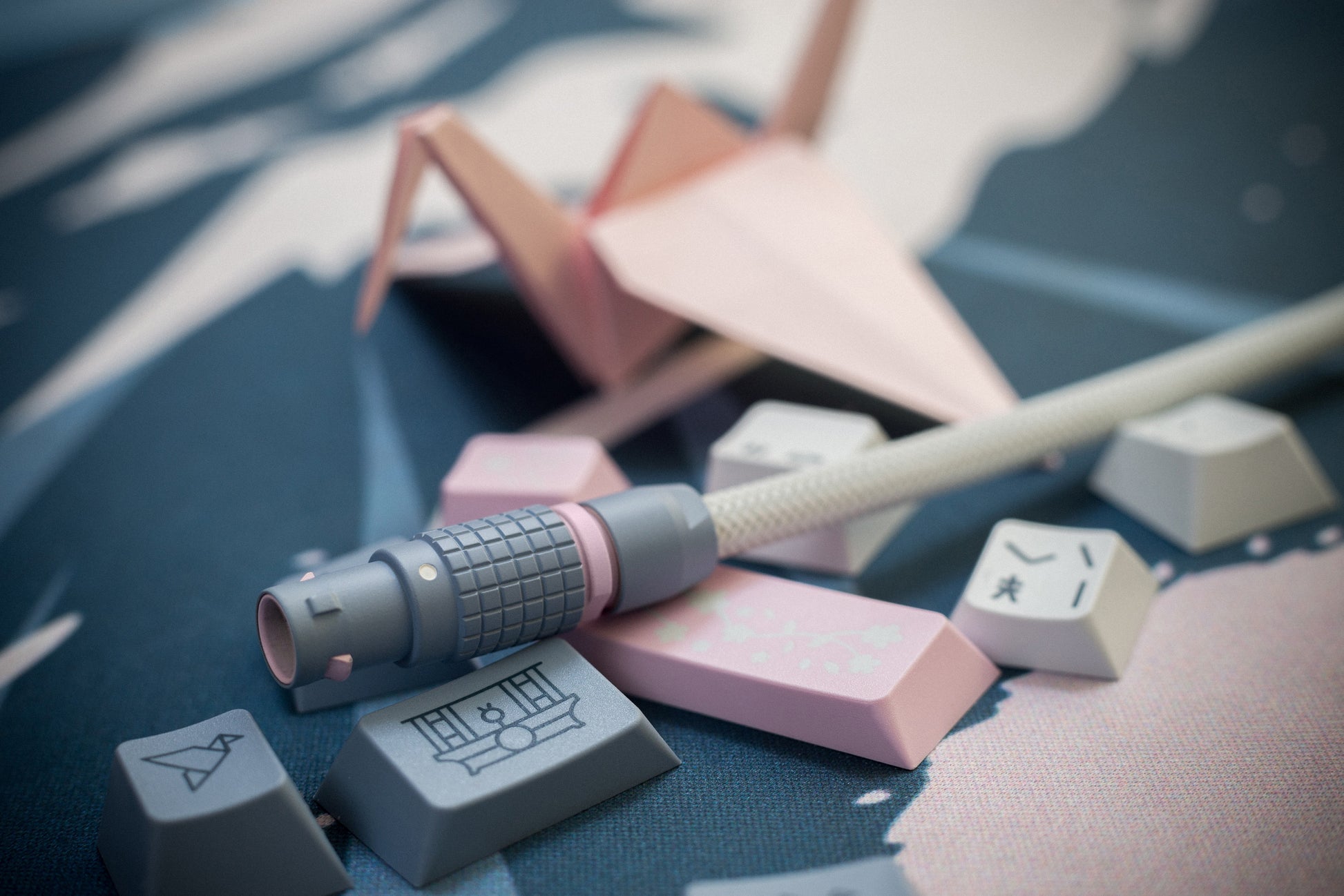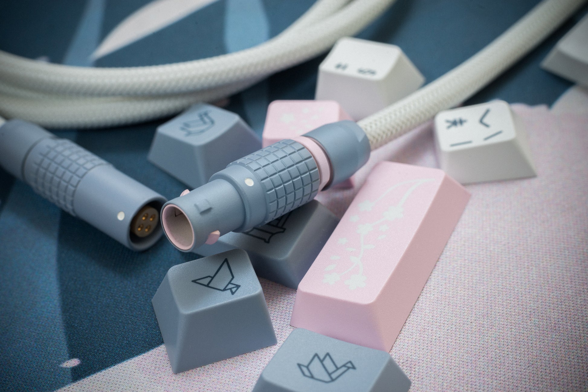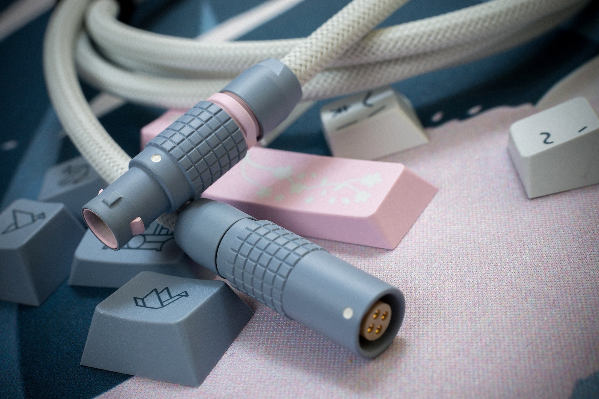 Quick Connect: 1B Lemo style finished in custom formulated Cerakote to match GMK Fuji keycaps. Main body matches the modifier keys, with the accent ring matching accent keys. All soldered connections are insulated with injected silicon.