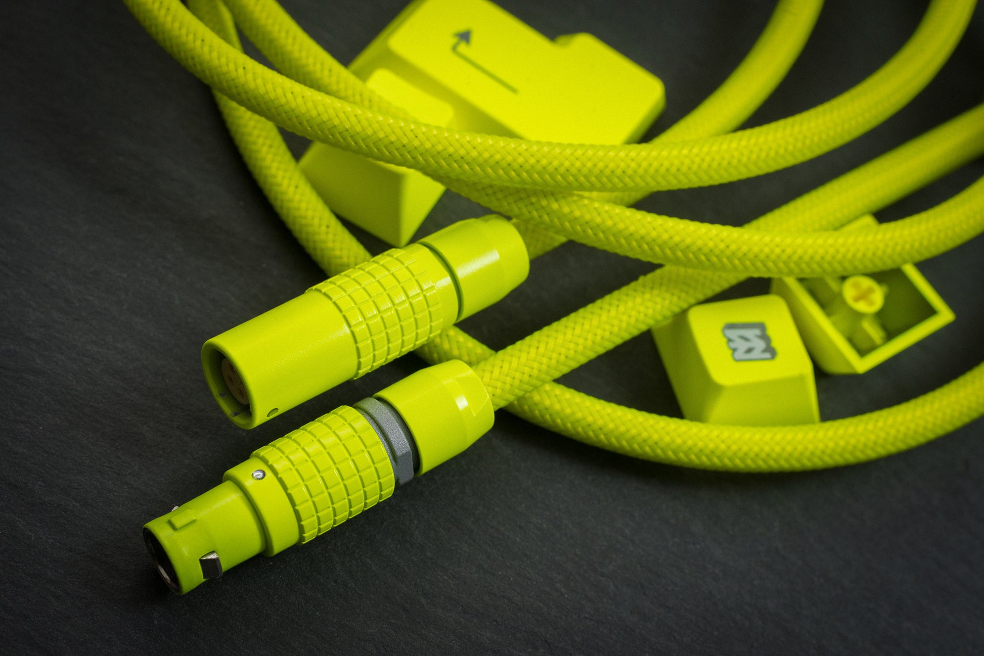 Quick Connect: 1B Lemo style finished in custom formulated Cerakote to match GMK Hi-Viz! keycaps. Main body matches the keys, with the accent ring matching the legend silver. All soldered connections are insulated with injected silicon.