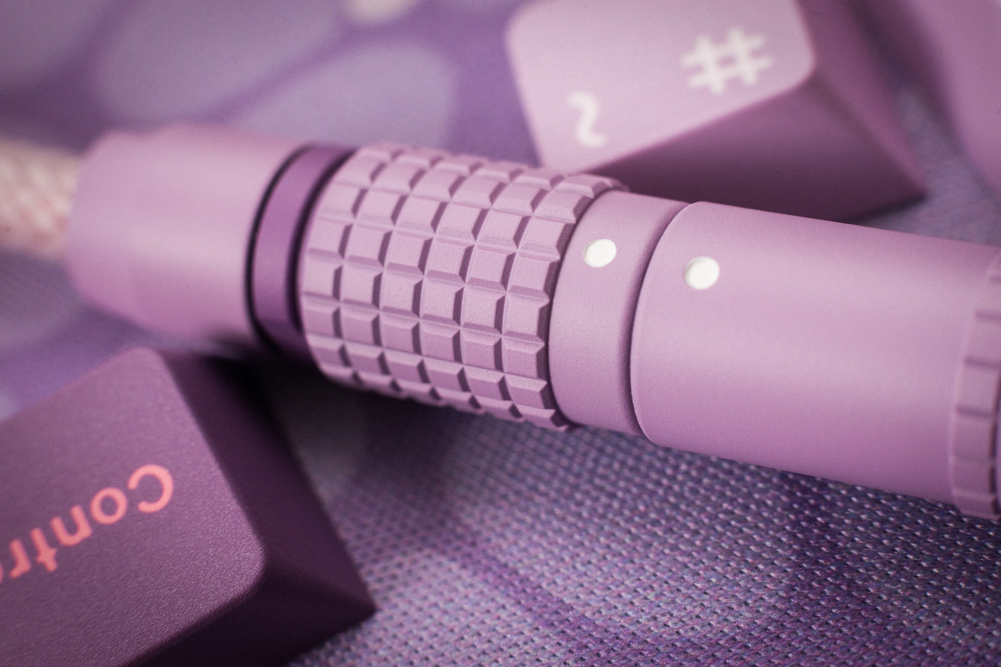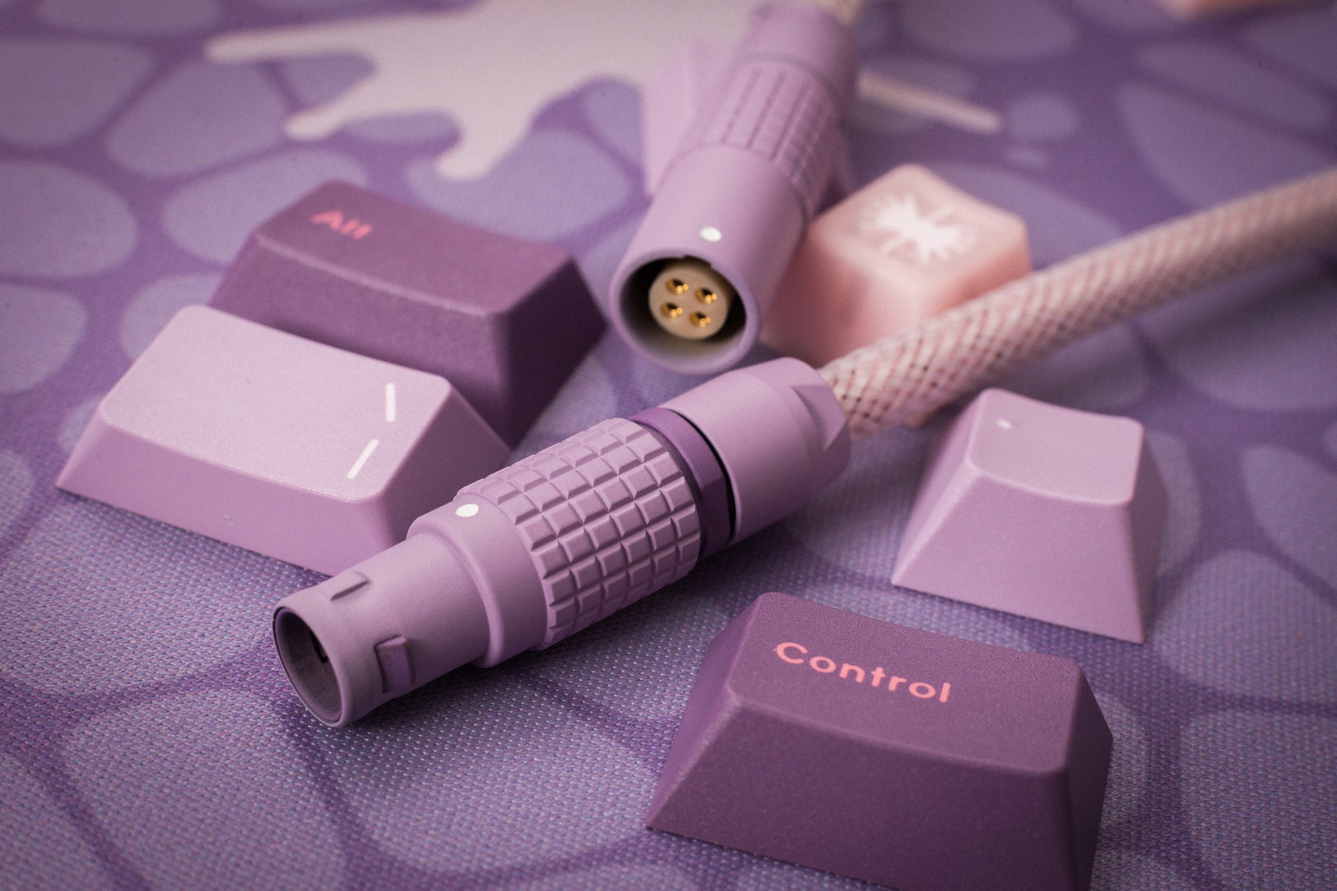 Quick Connect: 1B Lemo style finished in custom formulated Cerakote to match GMK Symbiote keycaps. Main body matches the alpha keys, with the accent ring matching modifier keys keys. All soldered connections are insulated with injected silicon.