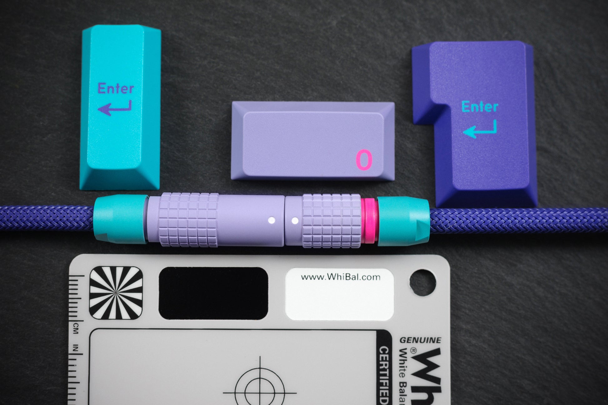 Quick Connect: 1B Lemo style finished in three custom formulated Cerakote colours to match GMK Vaporwave accent, alpha and legend colours. All soldered connections are insulated with injected silicon.