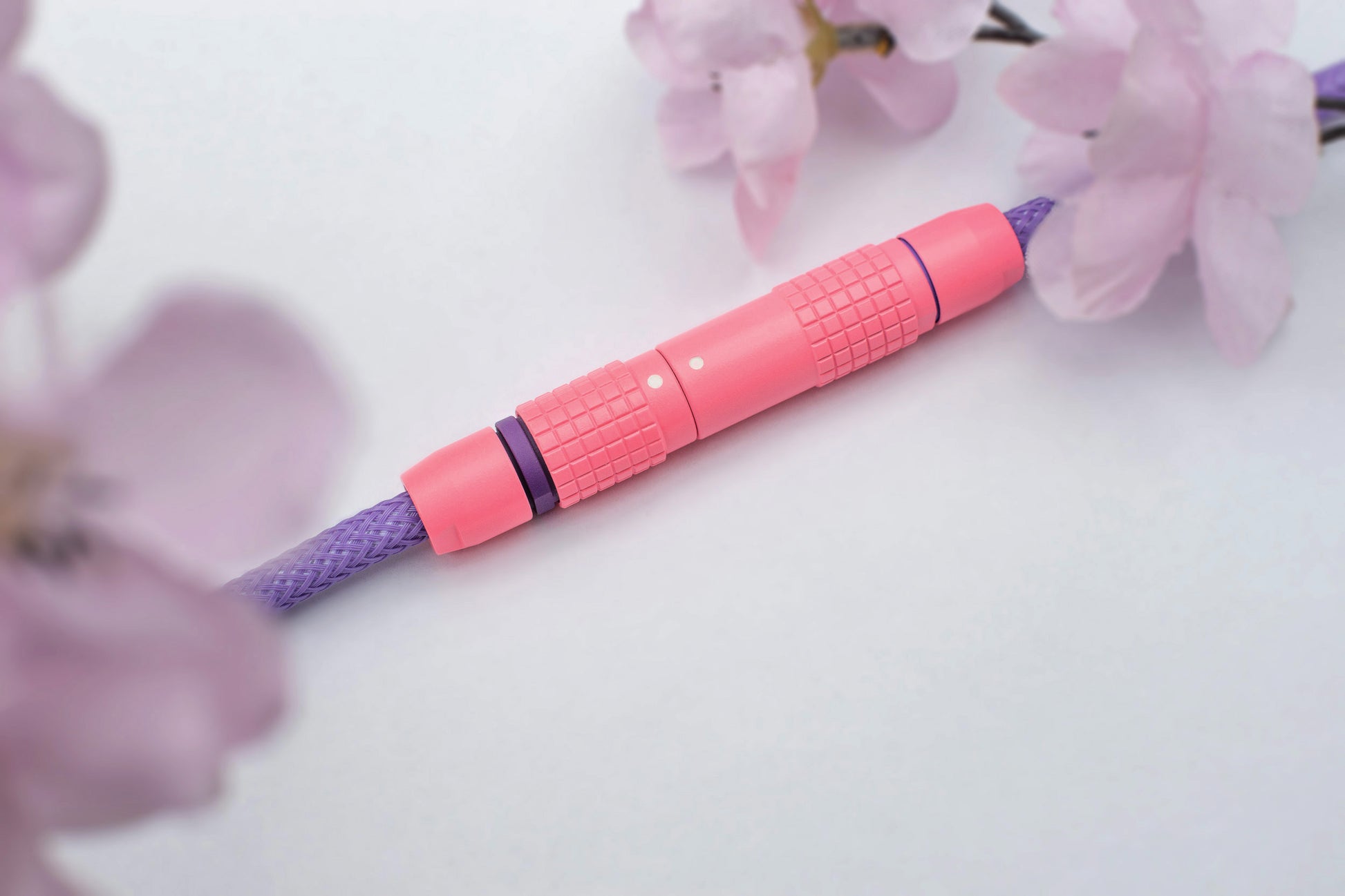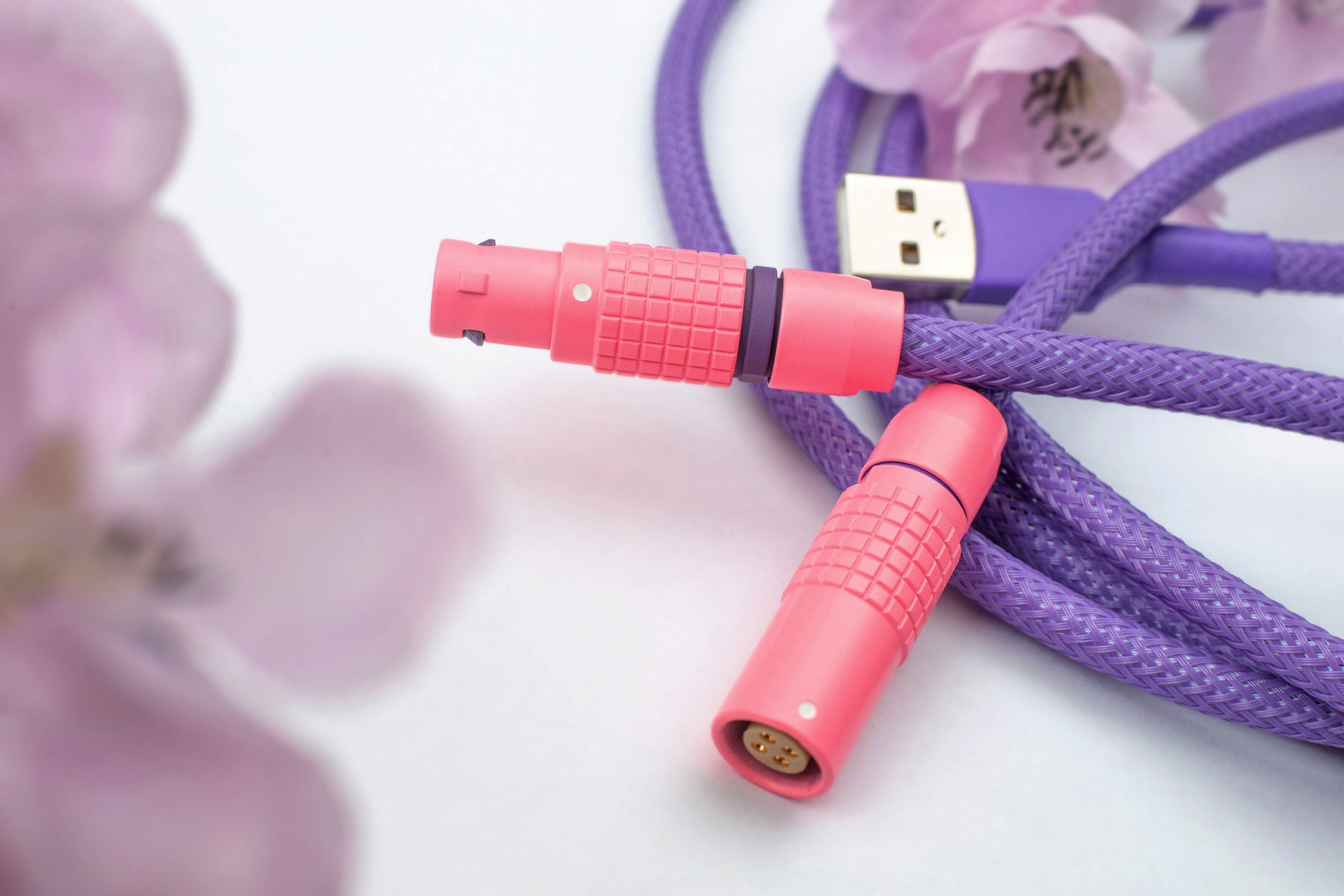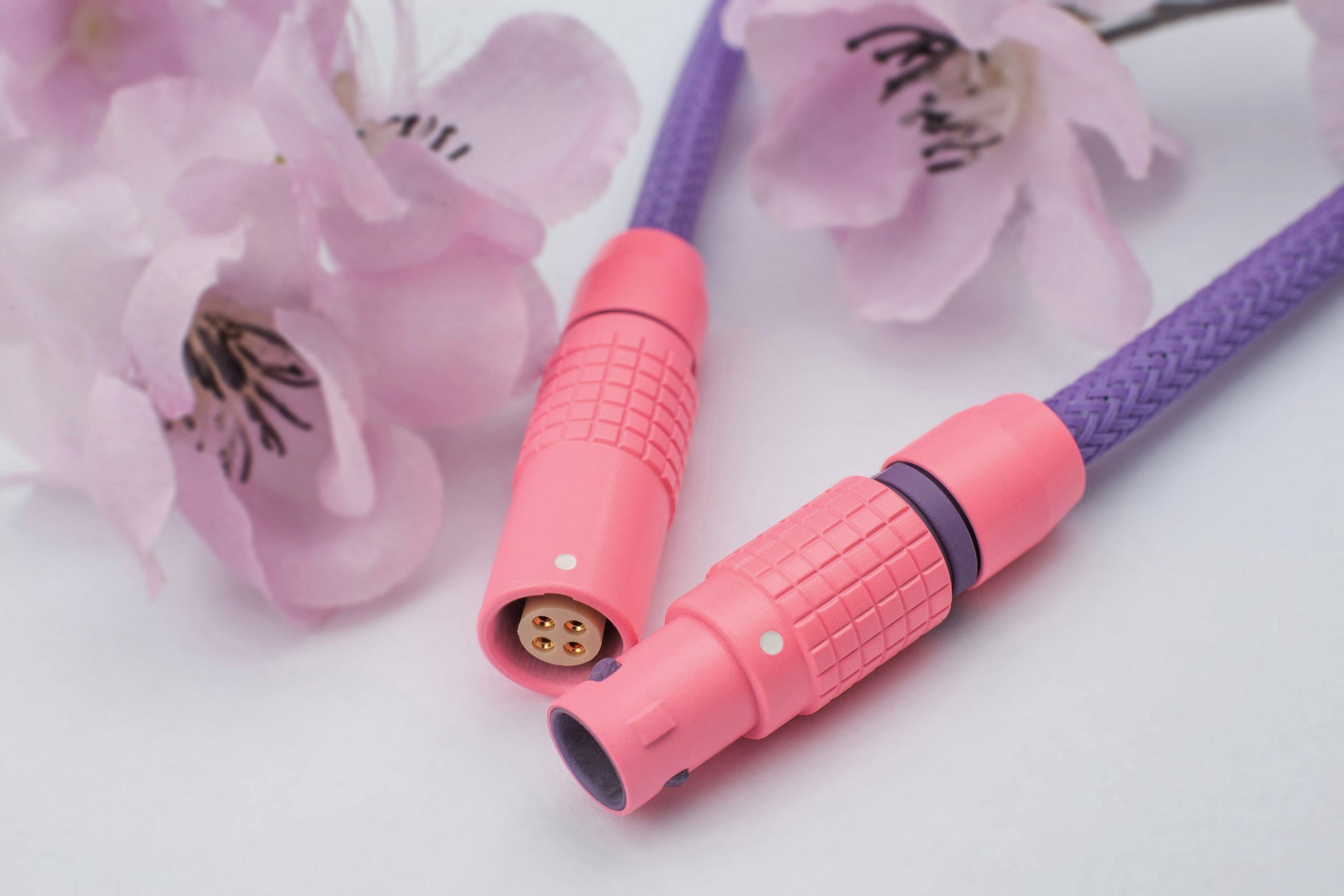 Quick Connect: 1B Lemo style finished in Pink Sherbet Cerakote with Bright Purple Cerakote accent. All soldered connections are insulated with injected silicon. White alignment dots. Purple heatshrink collet nut accent.