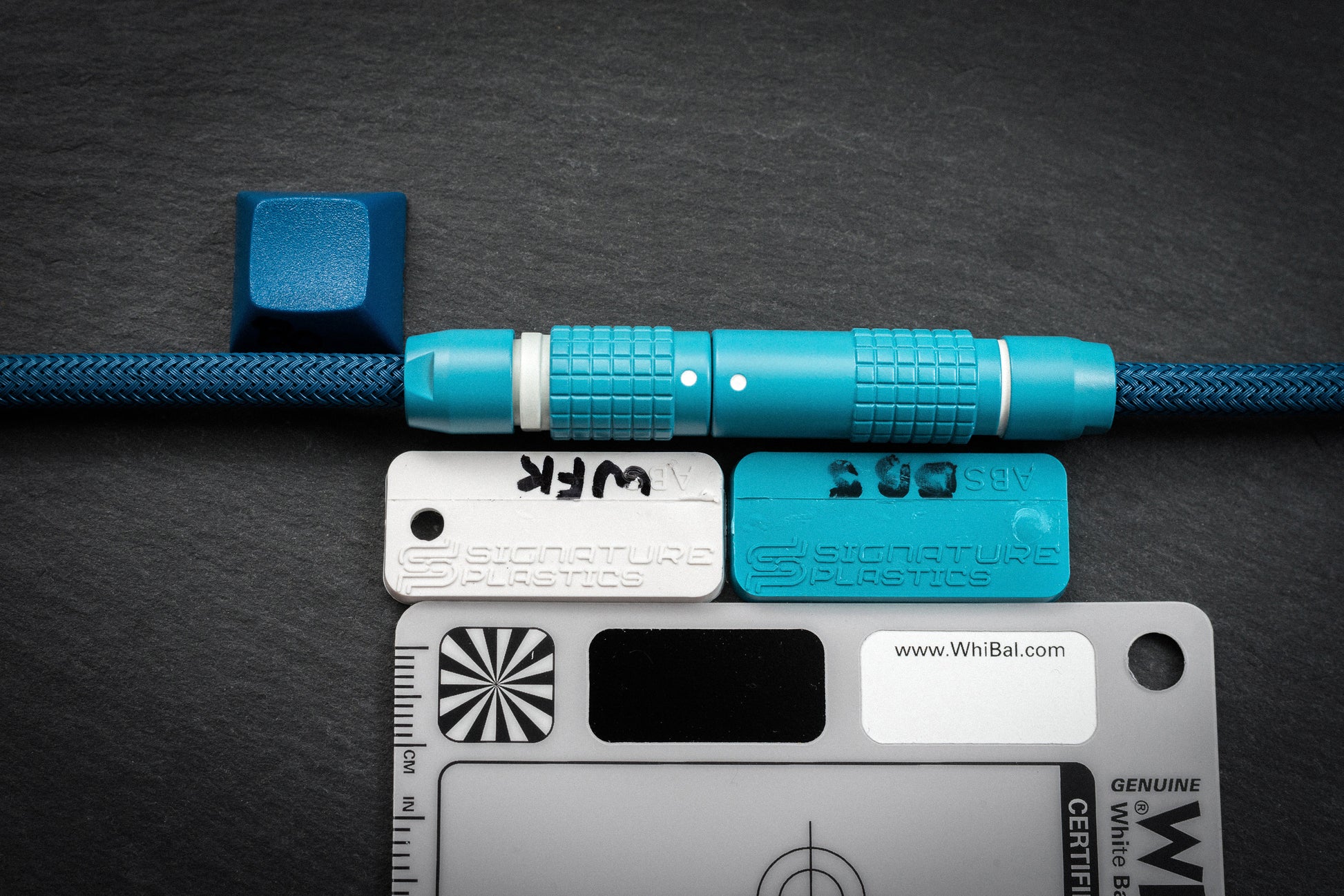 Certain ABS plastics are prone to fade or colour change with age and UV exposure, and also resin mixing tolerances are not perfect for any manufacturer from batch to batch, so one round of a keycap set may be slightly different from the next. Being different materials than the keycaps, Cerakote and sleeving may also appear different in certain lighting due to differences in surface texture. We have done all we can within the limits of practicality to ensure the best colour match, but minute differences may sometimes be beyond our control.