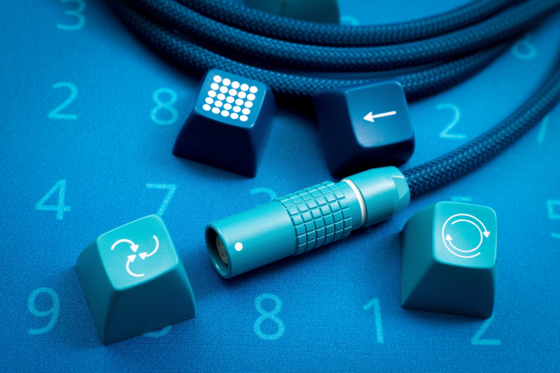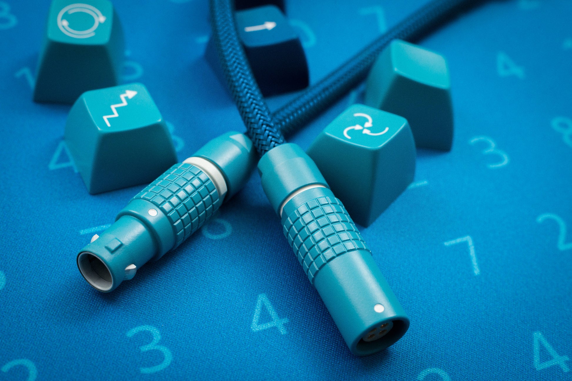 Quick Connect: 1B Lemo style finished in two custom formulated Cerakote colours. Main body matches the modifier keys and accent ring matches legends. All soldered connections are insulated with injected silicon.